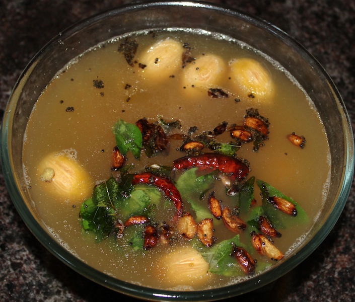 ಅದು ಚಿನ್ನದ ಬಣ್ಣಕ್ಕೆ ಬಪ್ಪಗ ಸಾಸಮೆ, ಜೀರಿಗೆ, ಮುರುದ ಒಣಕ್ಕು ಮೆಣಸು ಹಾಕಿ. ಅದು ಹೊಟ್ಟಿ ಅಪ್ಪಗ, ಇಂಗು, ಬೇನ್ಸೊಪ್ಪು ಹಾಕಿ, ರೆಜ್ಜ ಹೊತ್ತು ಮಡುಗಿ, ಒಗ್ಗರಣೆಯ ಸಾರಿಂಗೆ ಹಾಕಿ.