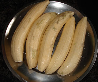 ಬಾಳೆಕಾಯಿಯ ಹೆರಾಣ ಚೋಲಿ ತೆಗದು, ನೀರಿಲ್ಲಿ 3-4 ನಿಮಿಷ ಮಡುಗಿ. ನೀರಿಂದ ತೆಗದು ಒಂದು ತಟ್ಟೆಲಿ ನೀರು ಬಳಿವಲೆ 4-5 ನಿಮಿಷ ಮಡುಗಿ.