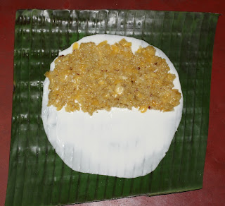 ಬಾಳೆ ಎಲೆಯ ಕಿಚ್ಚಿಲ್ಲಿ ಬಾಡ್ಸಿ, ಲಾಯಿಕಲಿ ಉದ್ದಿ ಮಡುಗಿ. ಕಾಯಿ ಕೆರದು, ಬೆಲ್ಲವ ಕೆರಸಿ ಕೆಳಾಣ ಚಿತ್ರಲ್ಲಿ ತೋರ್ಸಿದ ಹಾಂಗೆ ಲಾಯಿಕ ಕಲಸಿ ಮಡುಗಿ.