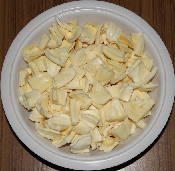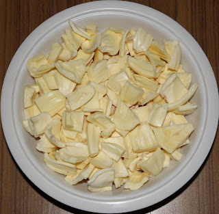 ಹಲಸಿನಕಾಯಿ ಸೊಳೆಯ ಕೆಳಾಣ ಚಿತ್ರಲ್ಲಿ ತೋರ್ಸಿದ ಹಾಂಗೆ ತುಂಡು ಮಾಡಿ.
