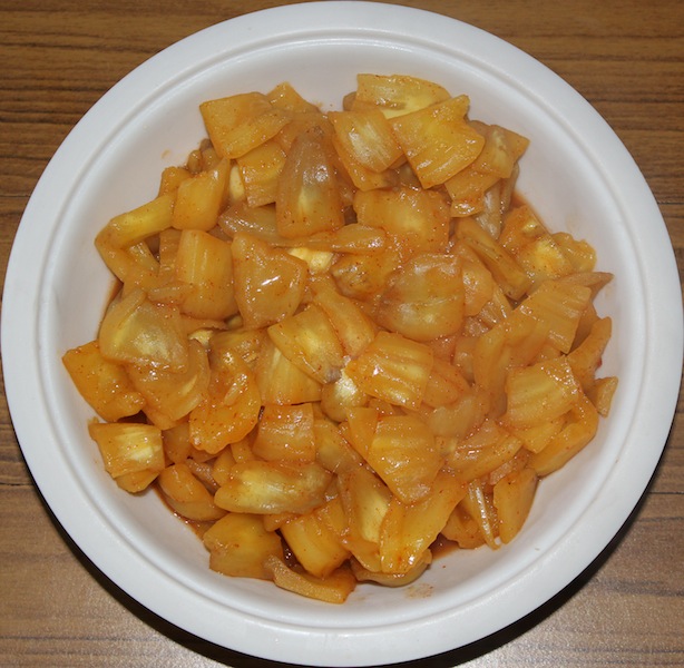 ಒಂದು ಪಾತ್ರಲ್ಲಿ ಕೊರದ ಹಲಸಿನಕಾಯಿ ಸೊಳೆ, ಉಪ್ಪು, ಬೆಲ್ಲ, ಅರುಶಿನ ಹೊಡಿ, ಮೆಣಸಿನ ಹೊಡಿ, ರೆಜ್ಜ ನೀರು ಹಾಕಿ ಮುಚ್ಚಲು ಮುಚ್ಚಿ ಬೇಶಿ.