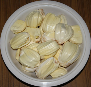 ಕೈಗೆ ರೆಜ್ಜ ಎಣ್ಣೆ ಪಸೆ ಮಾಡಿ, ಹಲಸಿನಕಾಯಿಯ ಕೊರದು ಕಡಿ ಮಾಡಿ, ಗೂಂಜು ತೆಗದು, ಕೆಳಾಣ ಚಿತ್ರಲ್ಲಿ ತೋರ್ಸಿದ ಹಾಂಗೆ ಕಡಿಂದ ಸೊಳೆಯ ತೆಗೆರಿ.