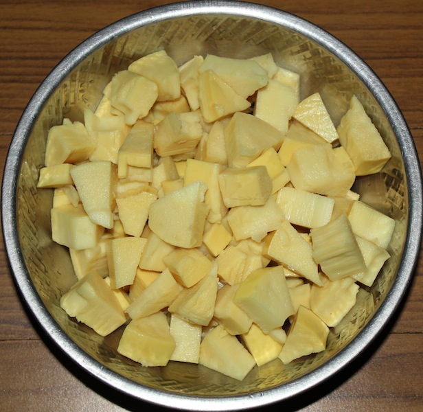 ಕಣಿಲೆಯ ಹೆರಾಣ ಚೋಲಿಯ ತೆಗದು, ಬೆಳಿ ಎಳತ್ತು ಇಪ್ಪ ಭಾಗವ ಕೆಳಾಣ ಚಿತ್ರಲ್ಲಿ ತೋರ್ಸಿದ ಹಾಂಗೆ ಕೊರೆರಿ.
