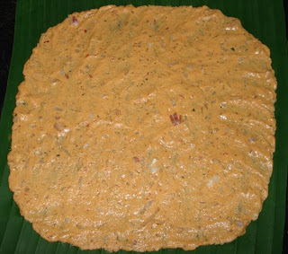 ಕೊಚ್ಚಿದ ನೀರುಳ್ಳಿಯ ಹಿಟ್ಟಿಂಗೆ ಹಾಕಿ ಲಾಯಿಕಲಿ ಬೆರುಸಿ. ರೆಜ್ಜ ಹಿಟ್ಟಿನ ತೆಕ್ಕೊಂಡು ಬಾಳೆ ಕೀತಿಲ್ಲಿ ಕೆಳಾಣ ಚಿತ್ರಲ್ಲಿ ತೋರ್ಸಿದ ಹಾಂಗೆ ತೆಳ್ಳಂಗೆ ಹತ್ಸಿ.
