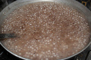 ಸಾಬಕ್ಕಿಯ ನೀರಿಲ್ಲಿ 6-8 ಘಂಟೆ ಬೊದುಳುಲೆ ಹಾಕಿ, ನೀರಿಲ್ಲಿ ತೊಳದು, ನೀರು ಬಳುಶಿ ಮಡುಗಿ.
